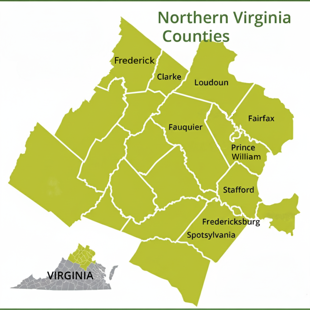 The standard $80 trip rate covers travel to most Northern Virginia counties listed. Some outlying areas may include a small additional distance charge, as noted in the table.